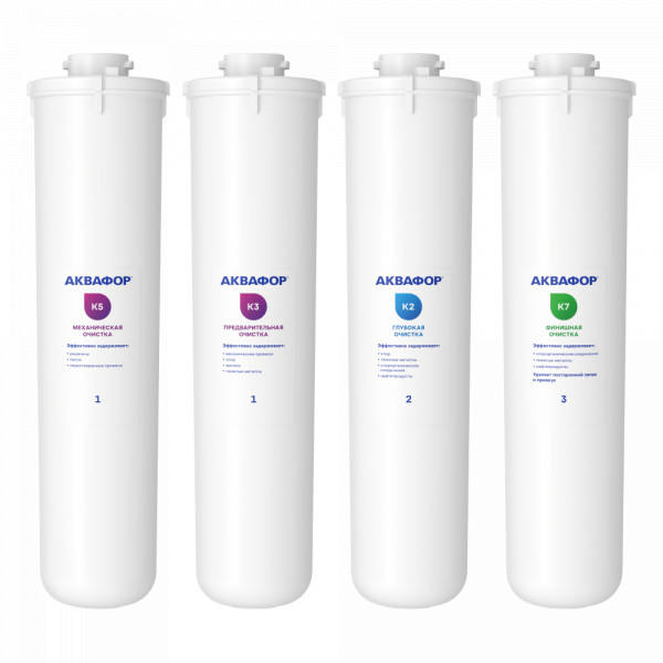 Комплект сменных модулей глубокой очистки. Оптимален для мягкой воды. В условиях жесткой воды он полностью выполняет функцию глубокой очистки от вредных примесей, однако не снижает минерализацию. Поэтому, если при кипячении на нагревательных элементах образуется белый налет, рекомендуем рассмотреть специализированный комплект с умягчающим модулем для глубокой очистки воды.